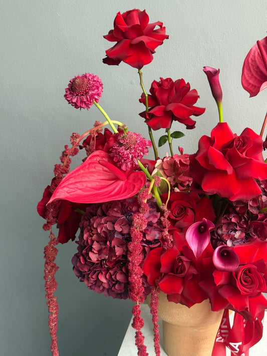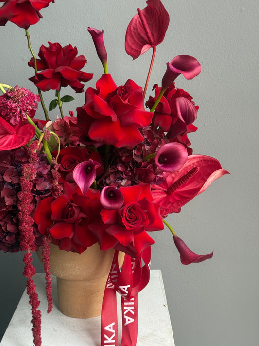 Flower Arrangement in a pot “Terracotta Flame” — anthurium, amaranth, calla lilies, roses