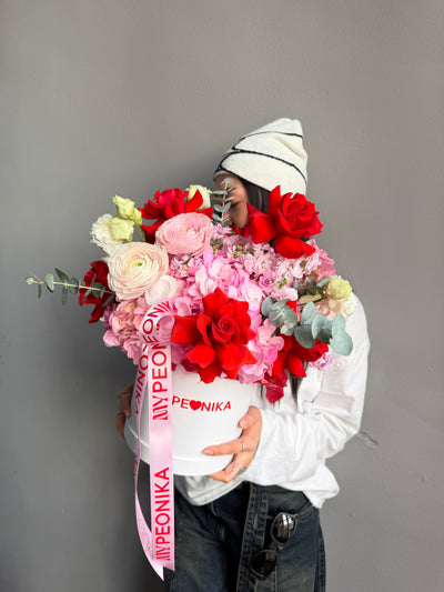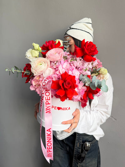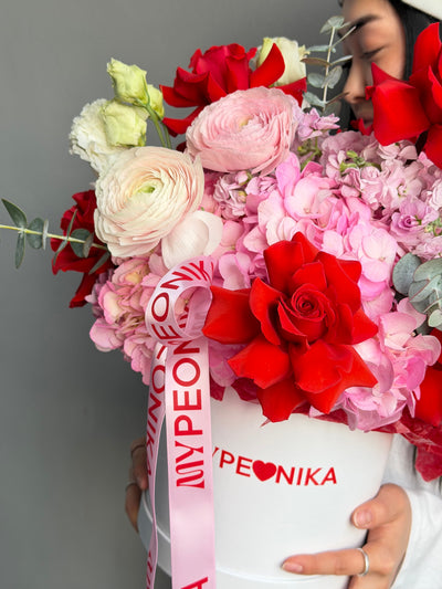 Flower Box “Tender Red” — ranunculuses, hydrangeas, roses
