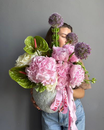 Interior Arrangement “ArtHaus” – hydrangea, allium, peonies, anturium (vase included)