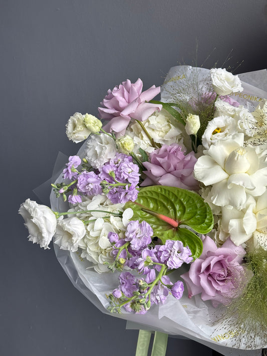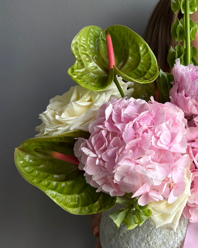 Bouquet “Vanilla Taste” — anthurium, roses, ranunculus, hydrangea