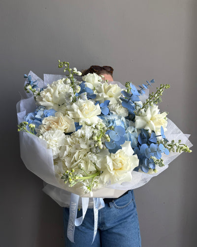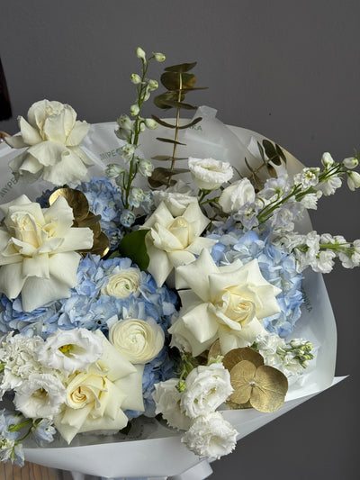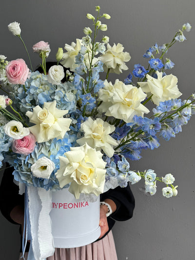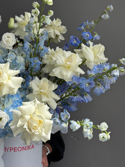 Bouquet “Below Zero” – hydrangeas, roses, delphiniums, carnation