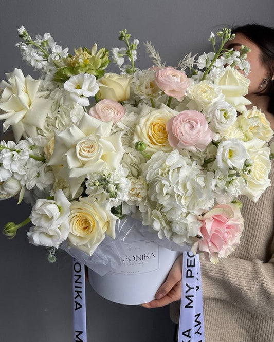 Flower box "Cloud of Petals" - Ranunculus, roses, hydrangeas