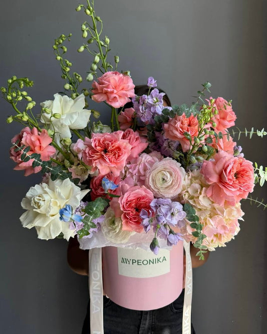 Flower Box “Blush Bloom Box” - roses, ranunculuses, delphiniums