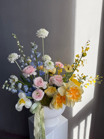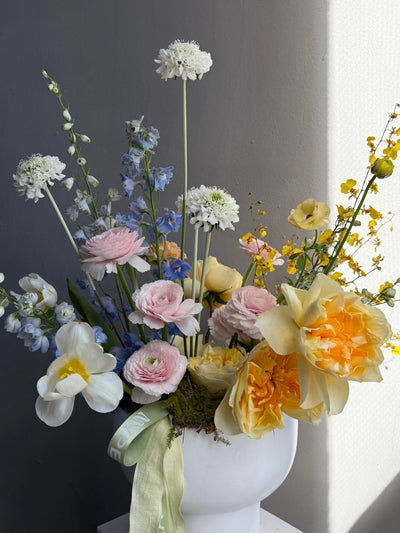 Interior Arrangement “Color Therapy” — ranunculus, roses, delphinium & seasonal blooms
