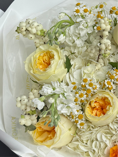 Bouquet “Lost Letters” — hydrangea, ranunculus, roses, eucalyptus