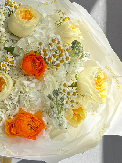 Bouquet “Peach Obsession” — ranunculus, roses, daisies, stock flowers