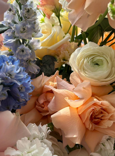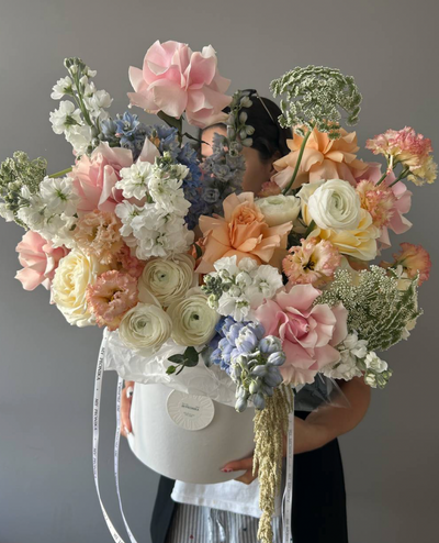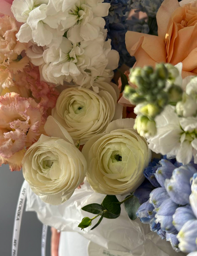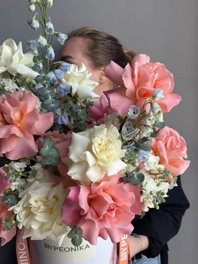 Flower Box "Pastel Serenity" - roses, delphiniums, stock