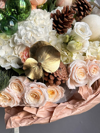 Bouquet “Merry Pine Delight” — roses, hydrangea, noble fir, pinecones