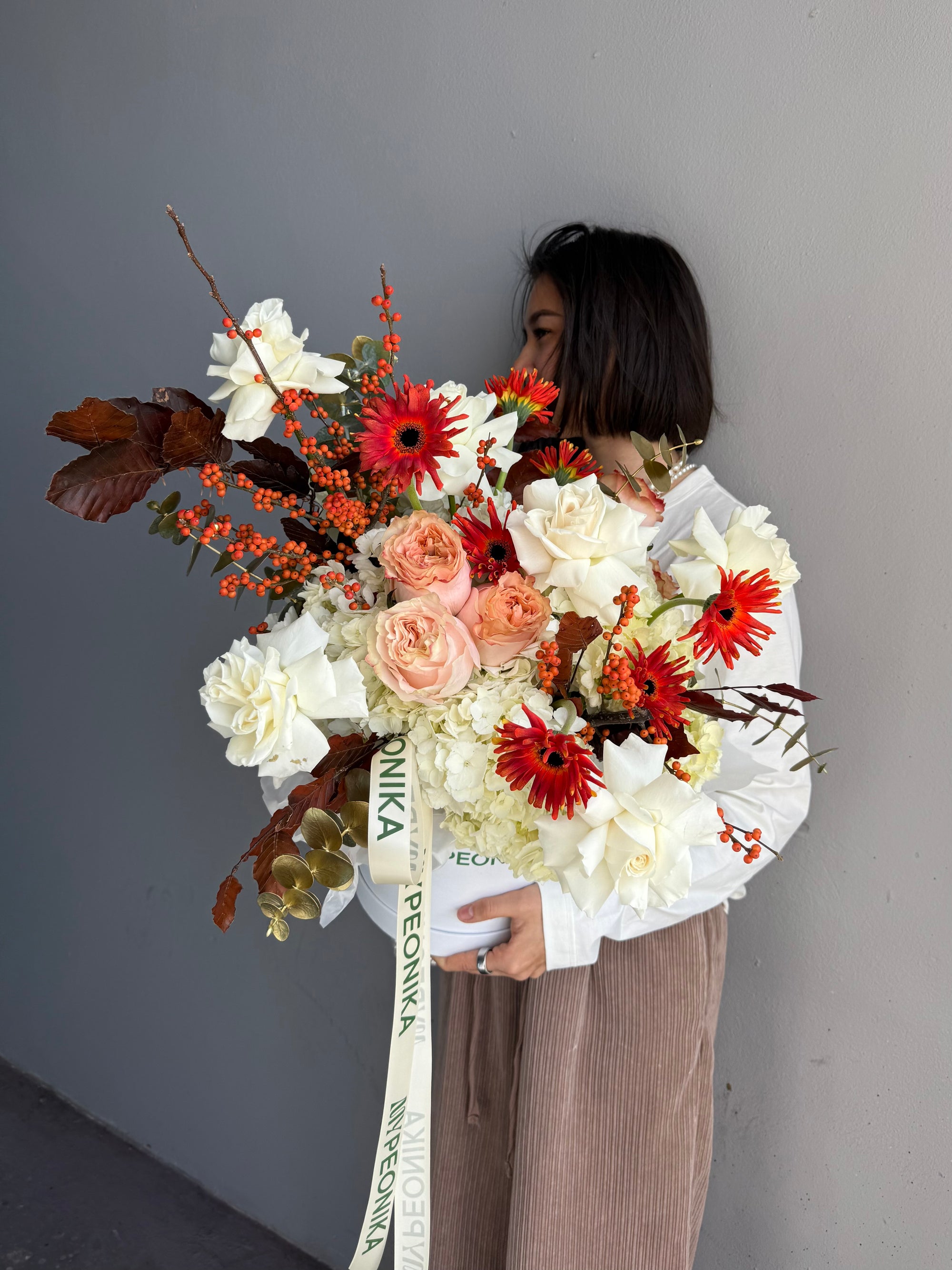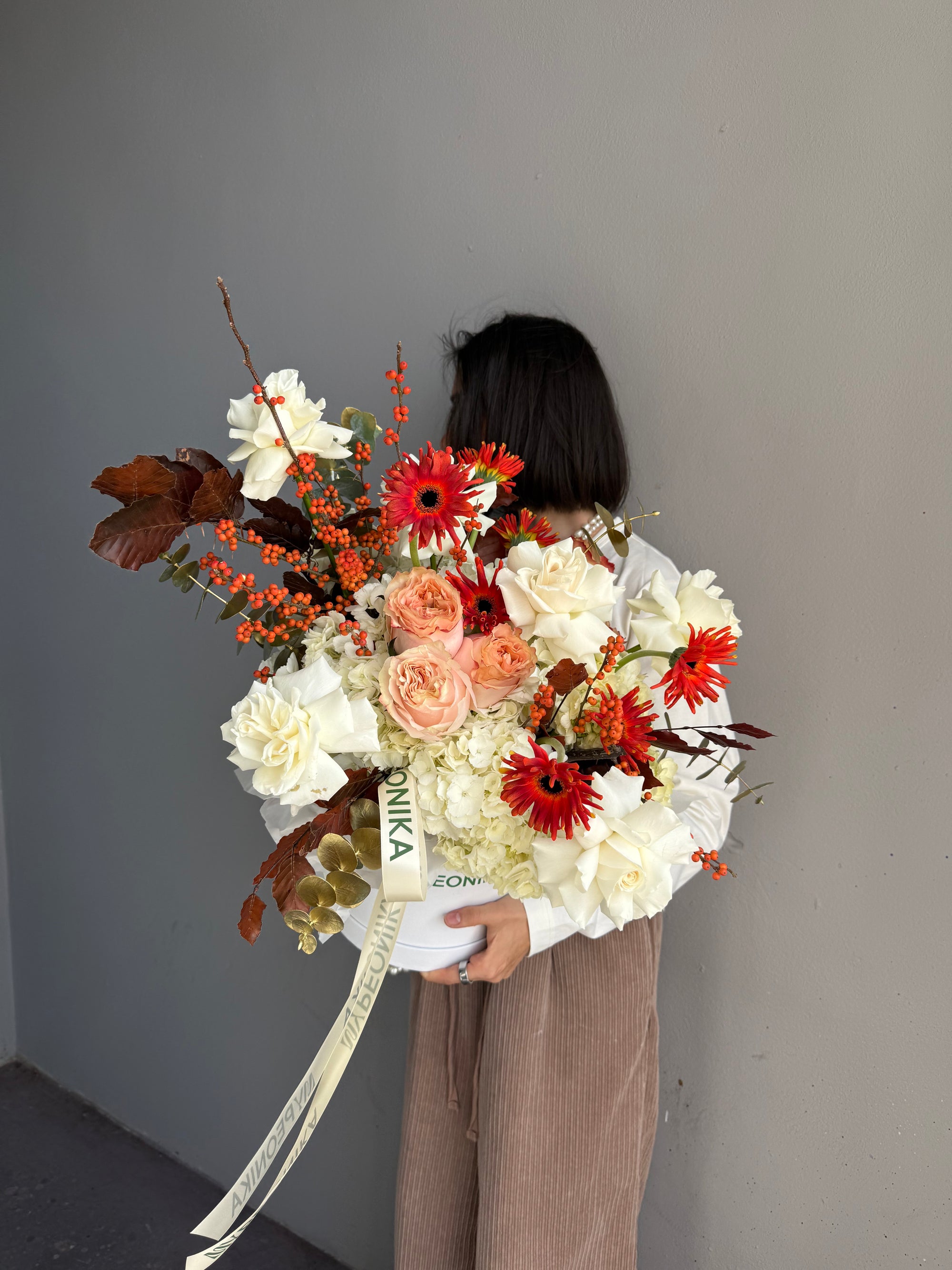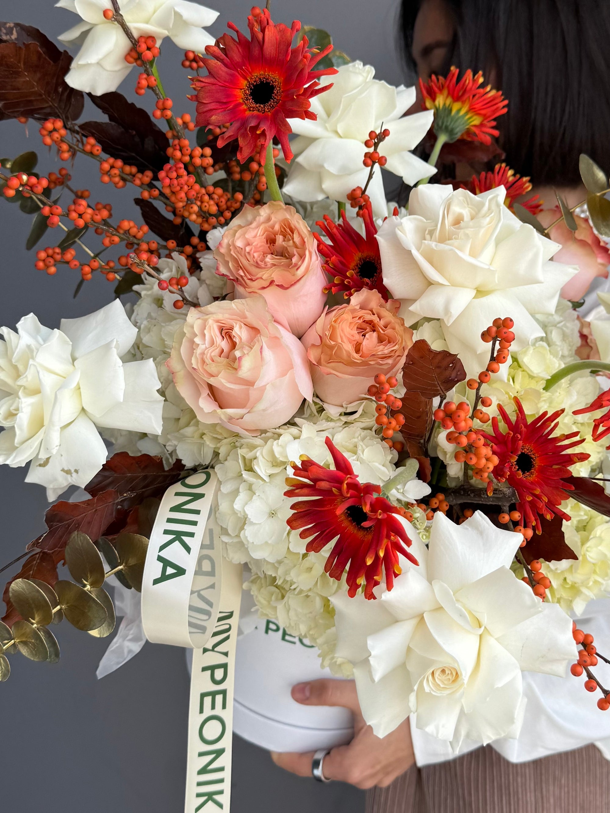 Flower Box “October Love” — gerbera, roses, hydrangea