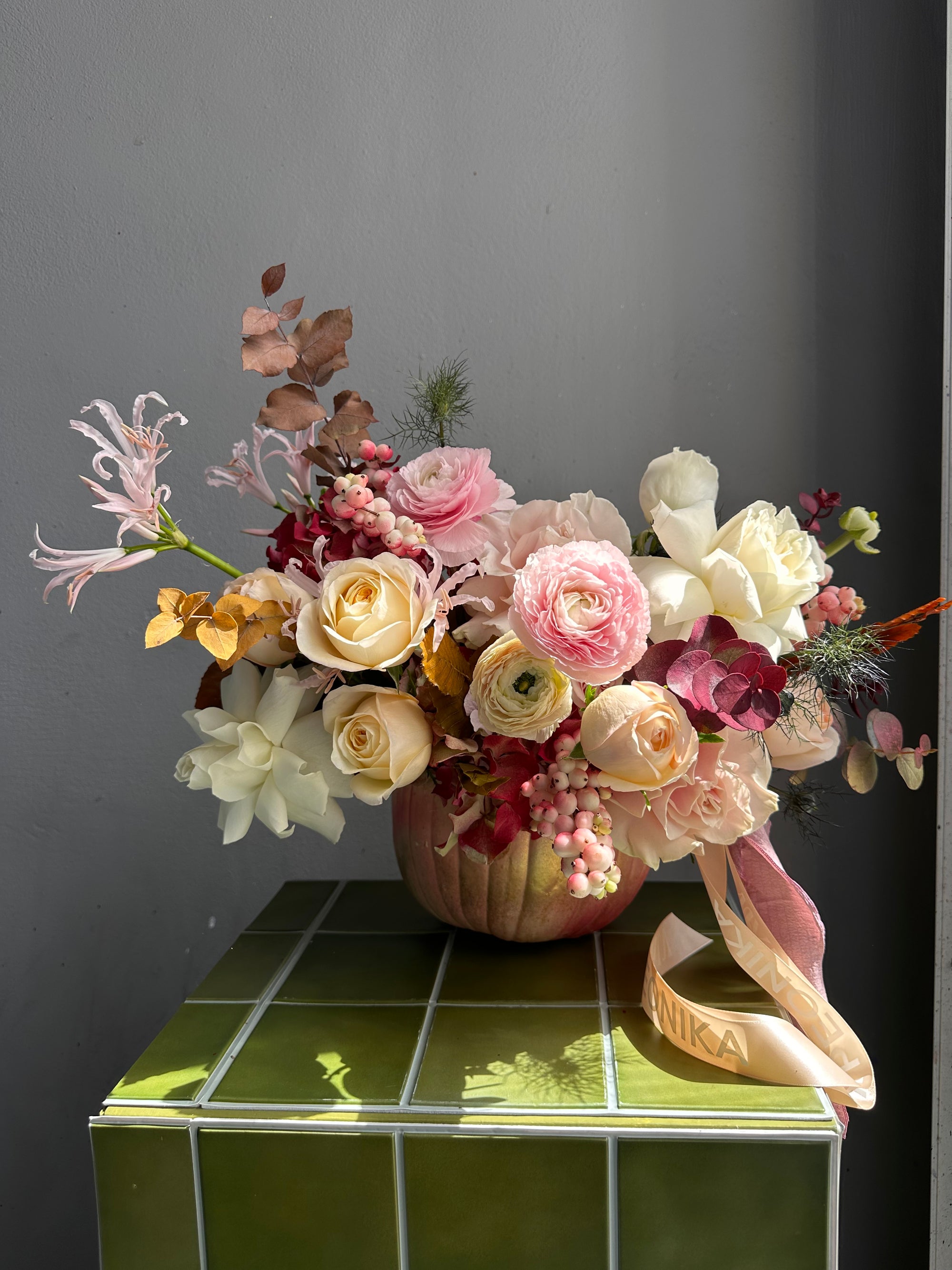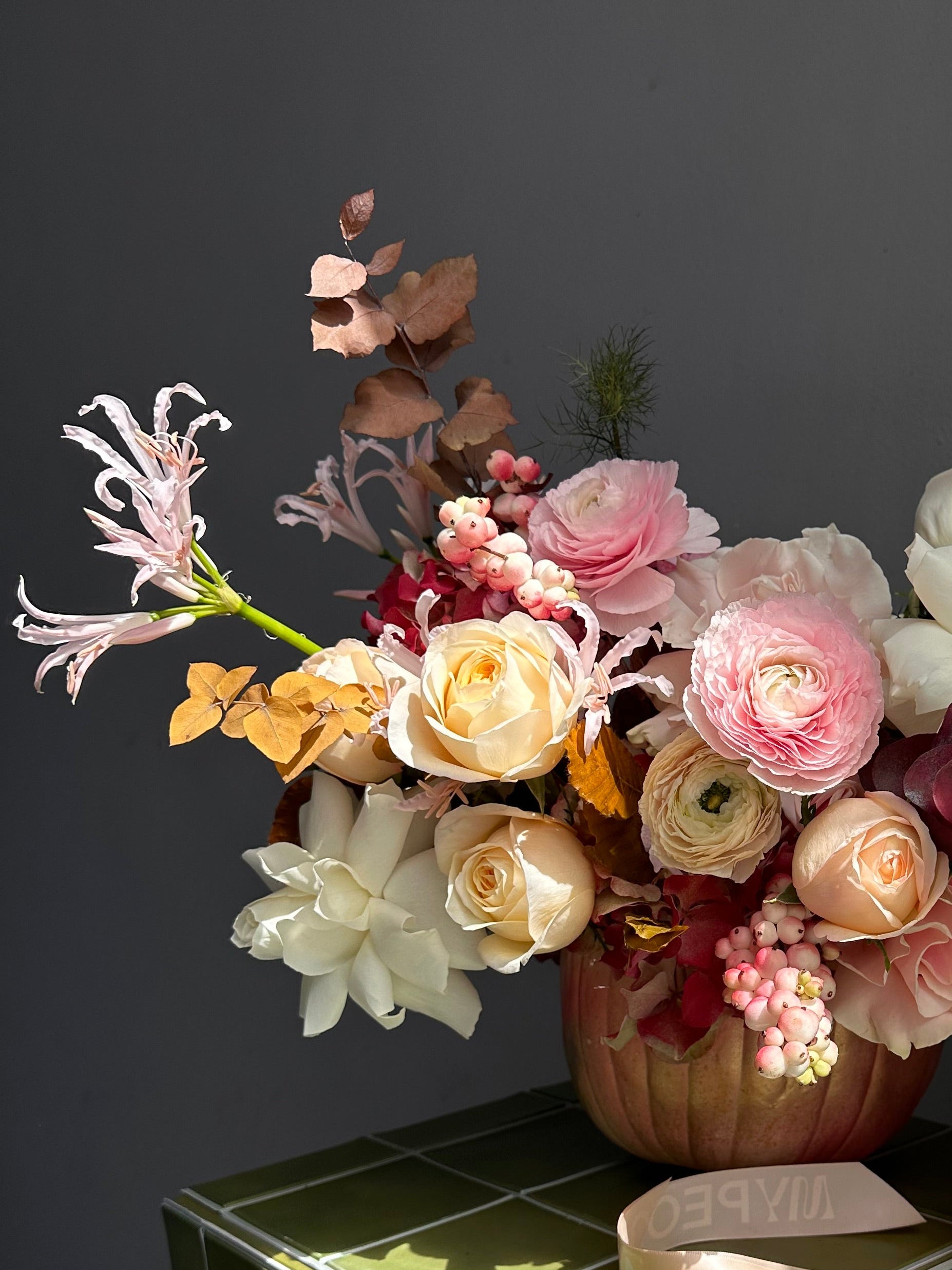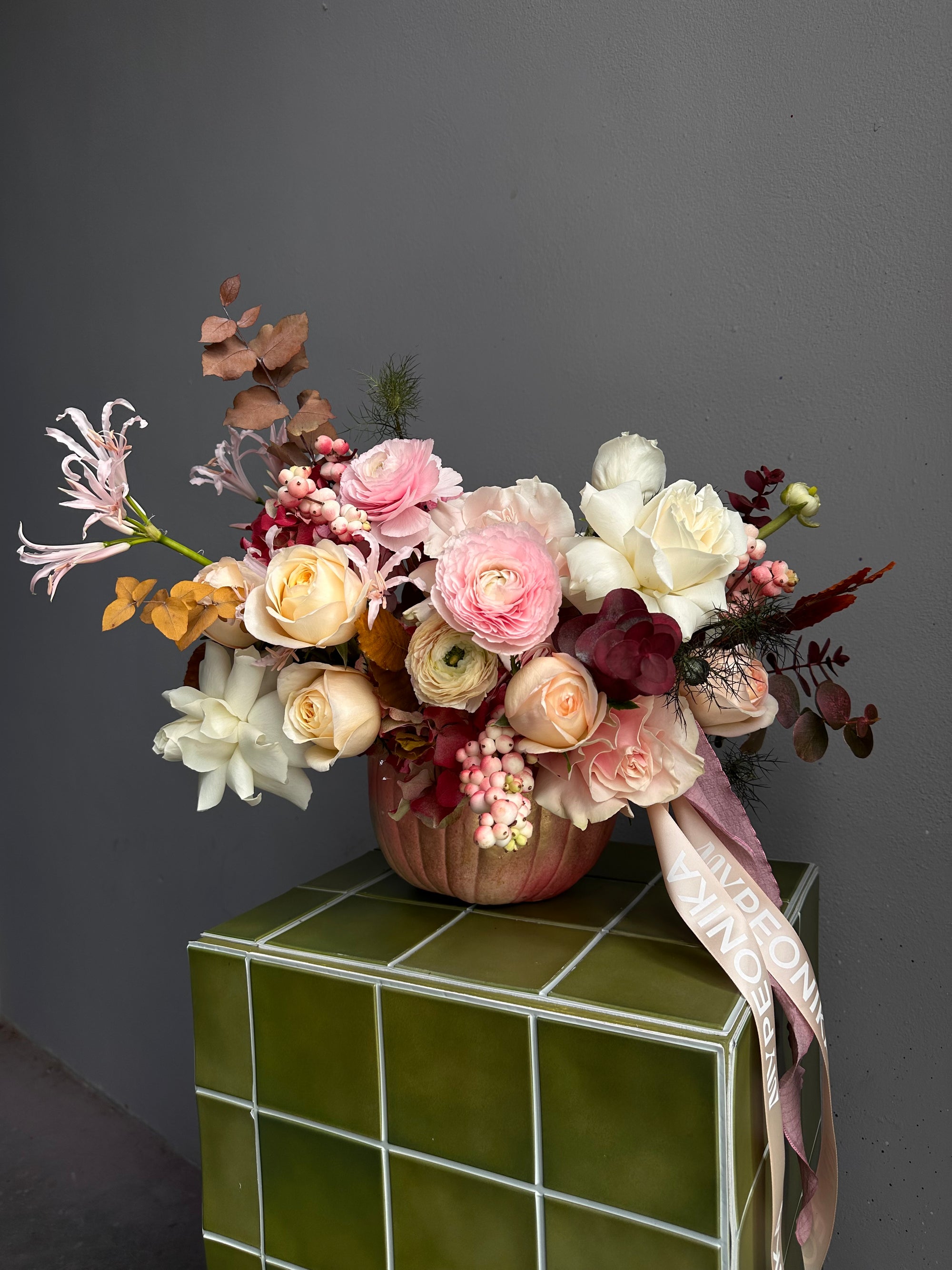 Floral arrangement “Pink Pumpkin” - ranunculuses, roses