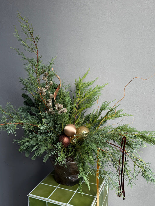 Bouquet “Merry Pine Delight” — roses, hydrangea, noble fir, pinecones