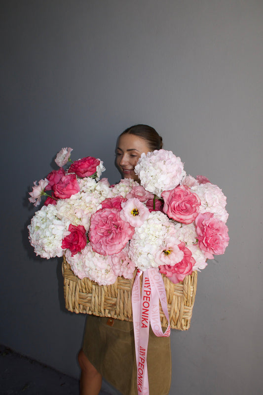 Flower basket “Pink Is My Power Color" - roses, hydrangeas