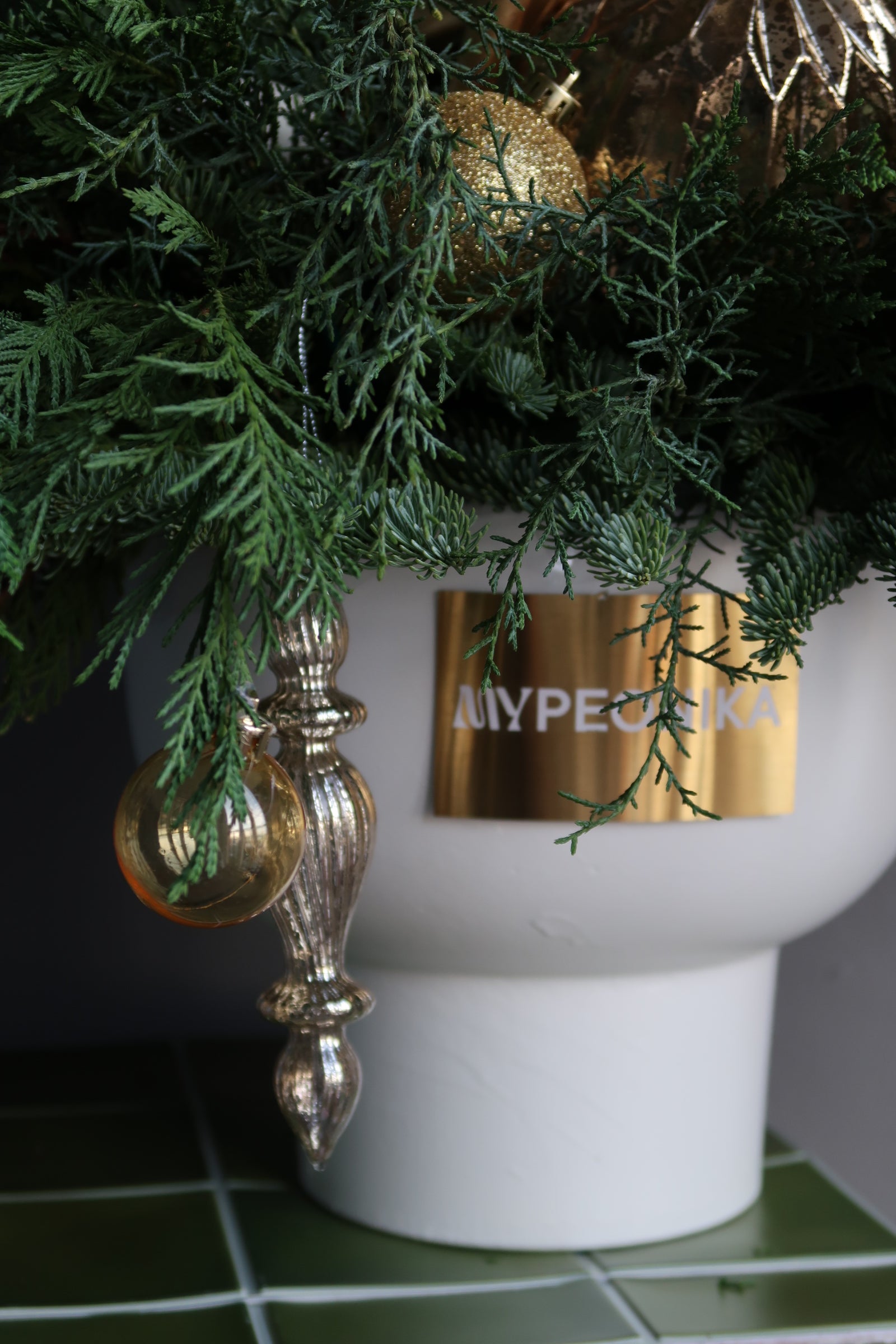 Bouquet “Winter Magic” — roses, evergreen branches, hydrangea, rowan berries