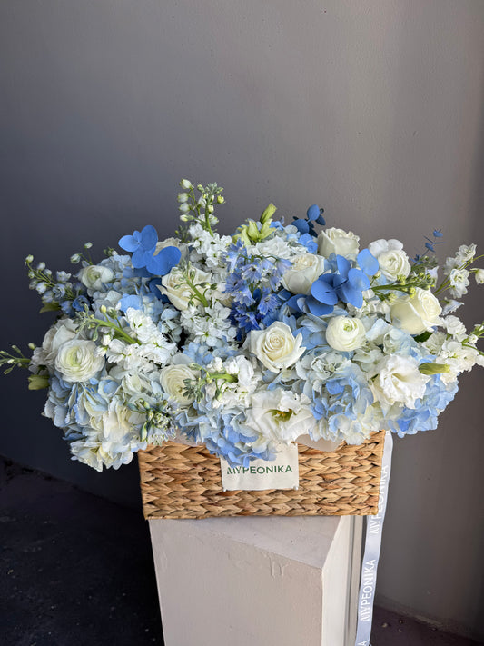 Flower Basket "Misty Blue" - hydrangeas, roses, stock