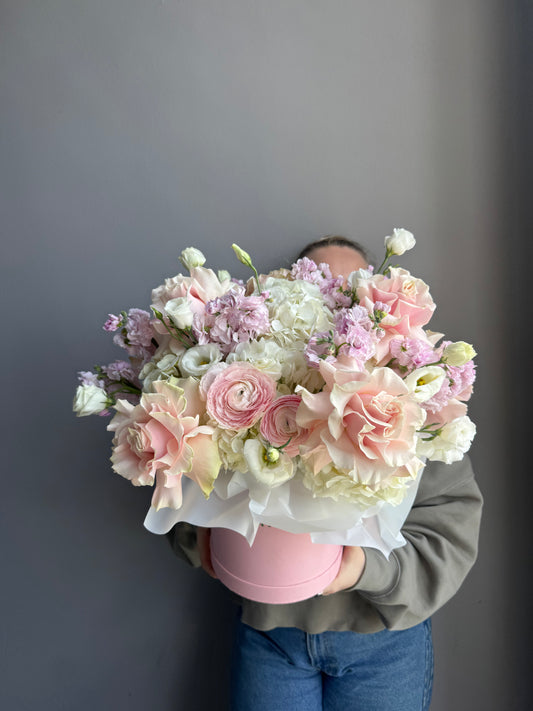 Flower Box “Tender Pink Tranquility” - roses, hydrangeas, ranunculuses