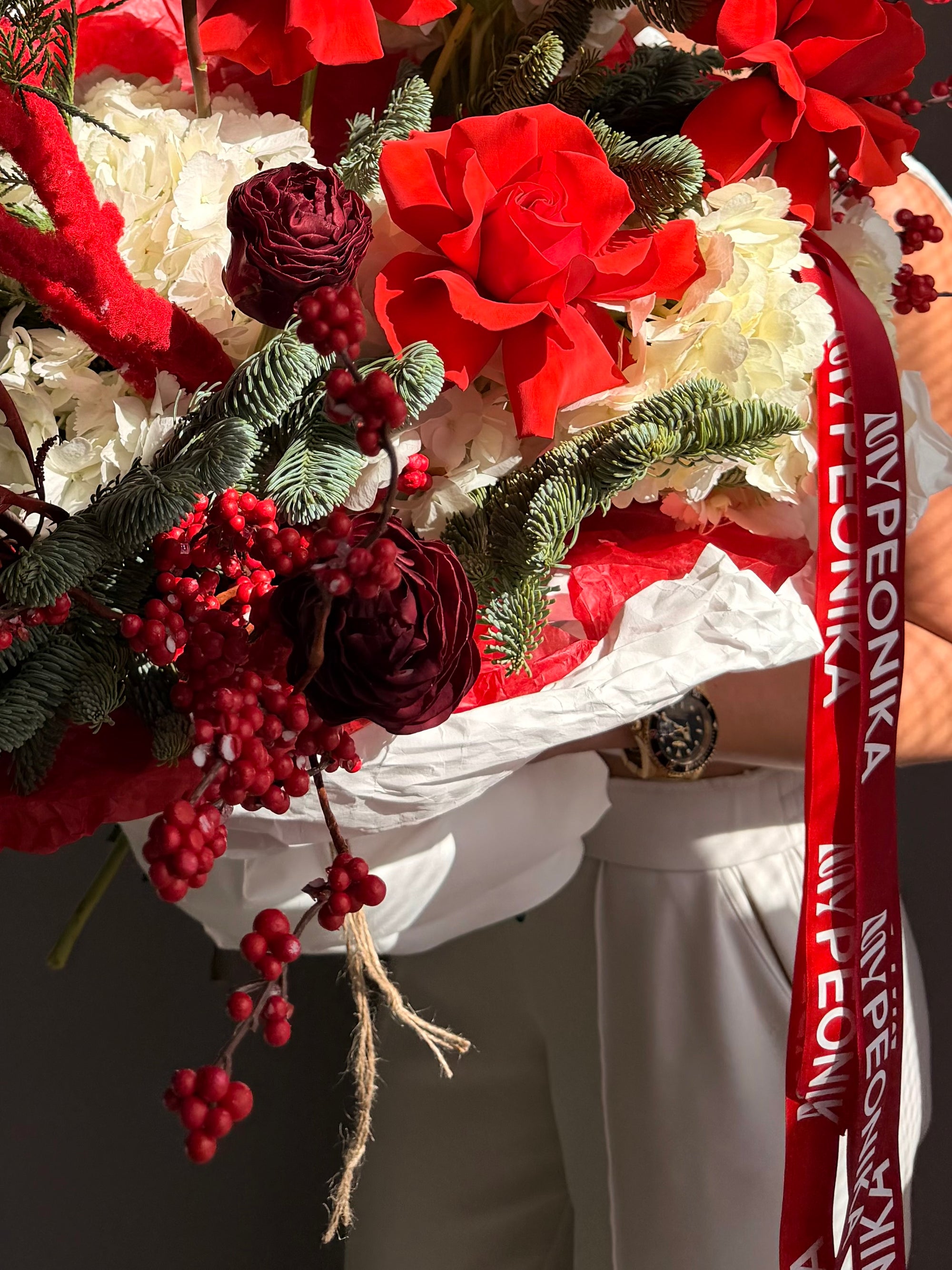 Bouquet “Winter Magic” — roses, evergreen branches, hydrangea, rowan berries