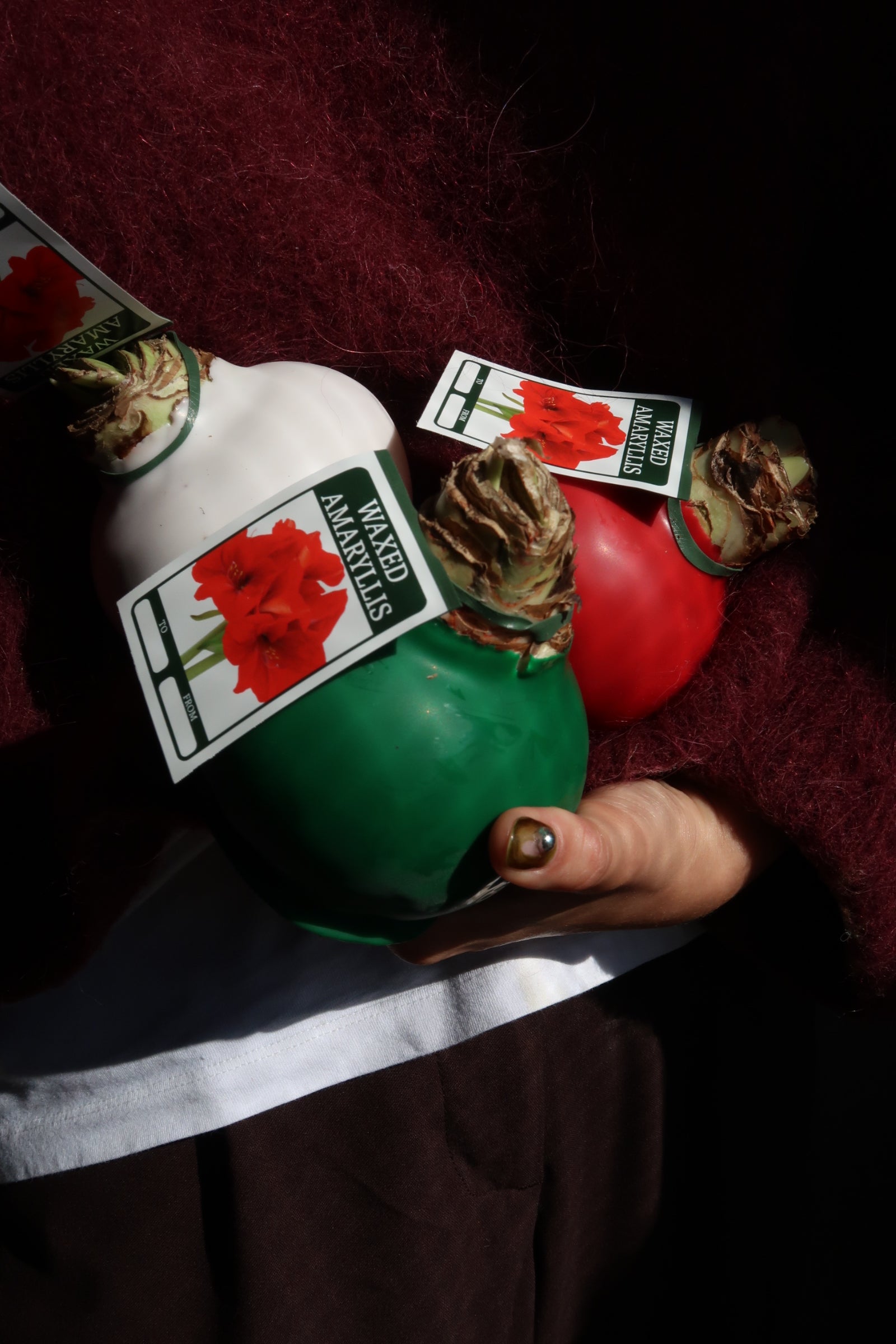 Interior Arrangement “Holiday Ruby Glow” — ranunculus, roses, hydrangea, anthurium, amaryllis