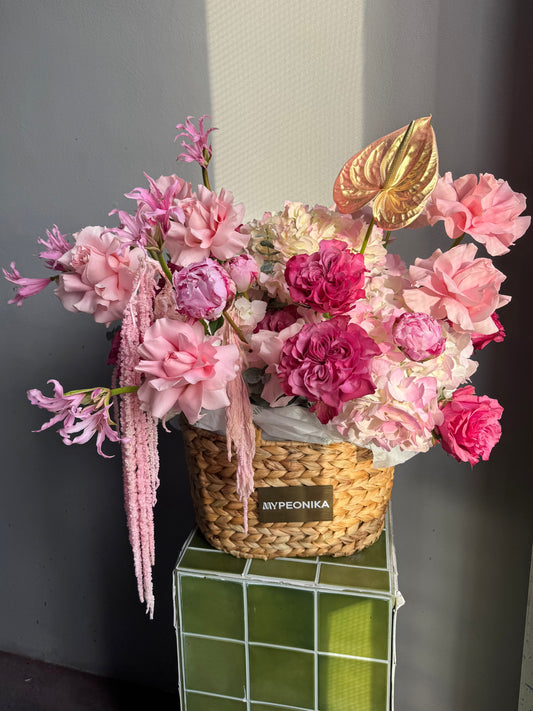 Flower Basket “Hyperpink Lite” — anthurium, amaranth, roses, hydrangea