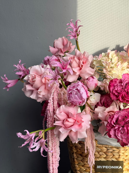 Flower basket “Pink Is My Power Color" - roses, hydrangeas