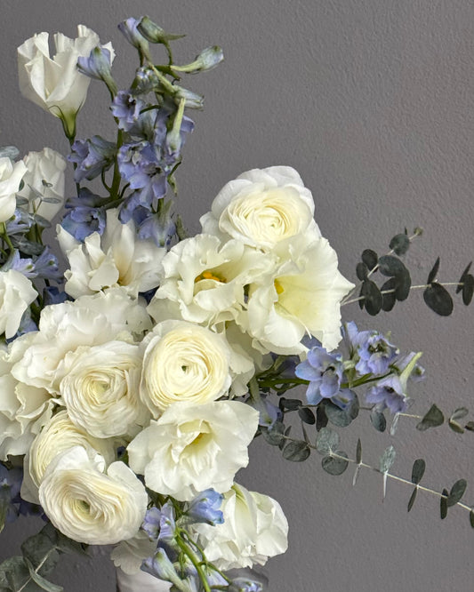 Wedding bouquet "Snowlight Bloom" - Ranunculus, delphinium, lisianthus