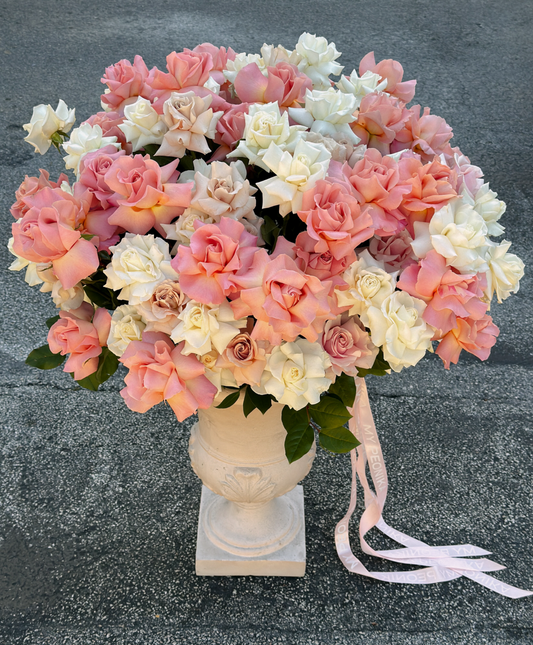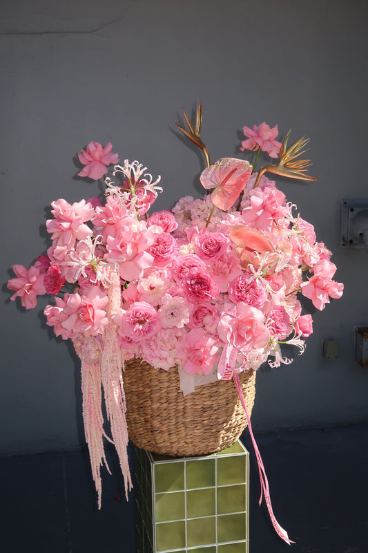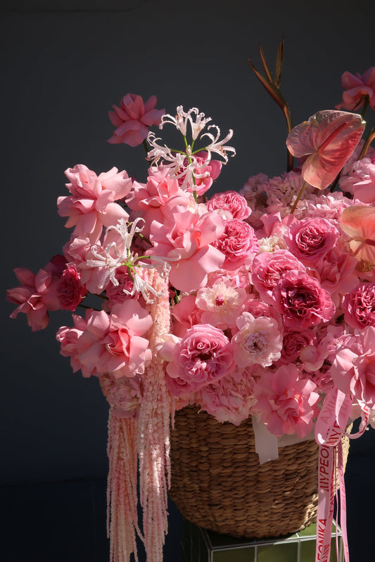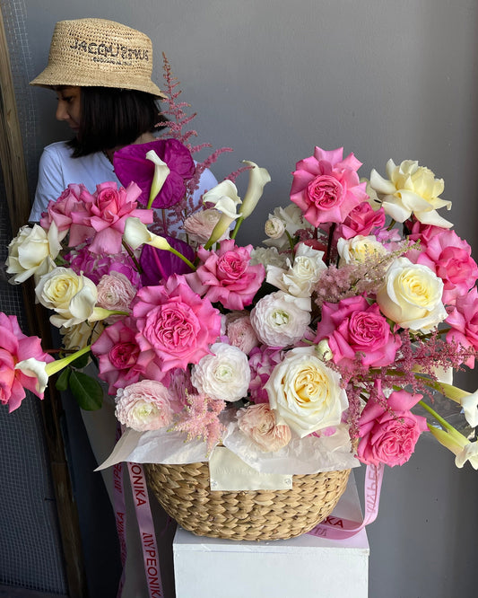 Flower basket “Rosy Splendor" - roses, calla lilies, ranunculuses (ONLY MIAMI)