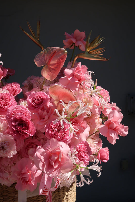 Flower Basket “Hyperpink” — anthurium, strelitzia, roses, hydrangea