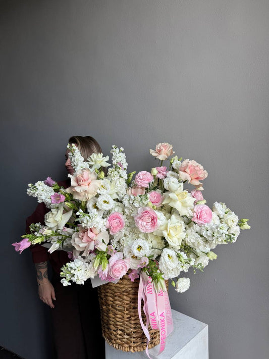 Flower Basket "Whispering Angel" - ranunculuses, hydrangeas